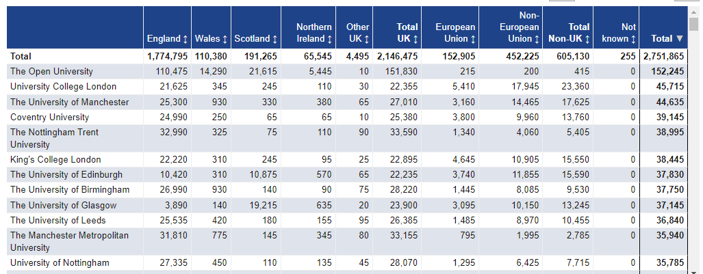 当然这么想也是有道理的,但是要知道英国的大学在校人数有可能是几何形的倍数差异,这与学校的建校时间,占地面积,或是拓展分校的程度等因素息息相关,因此在校人数可能差异巨大,比如曼大、UCL、考文垂的硕士留学生就有上万人。